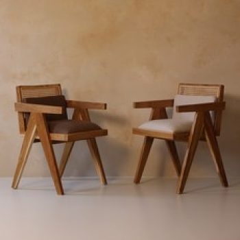피에르잔느레의 1인용 안락 카페 의자는 아이보리 컬러로 제공되며, 특히 그 독특한 디자인이 돋보이는 제품입니다.