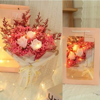 우리 제품의 독특한 특징은 코코도르 비누꽃 꽃다발과 함께 제공되는 핑크 쇼핑백 세트입니다.
