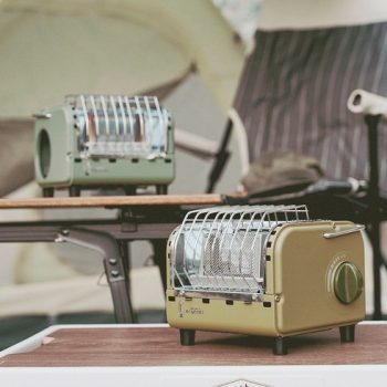 우리 제품은 휴대하기 편한 카키 색상의 국내 생산 캠핑 가스 난로 휴대용 히터입니다!