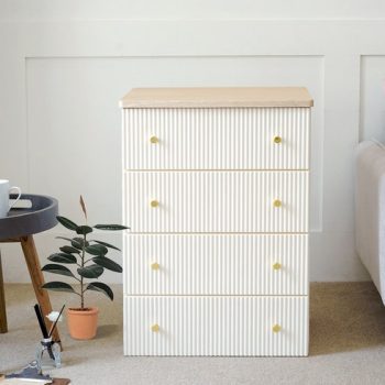 제이디퍼니처 로미 서랍장은 백화이트 컬러로 제공되며, 4개의 고유한 서랍이 있다.