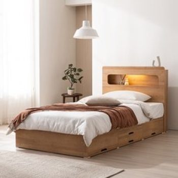 [삼익가구]러버 LED 4단 수납 원목 침대(YS 파워 본넬스프링 매트리스-슈퍼싱글), 내추럴