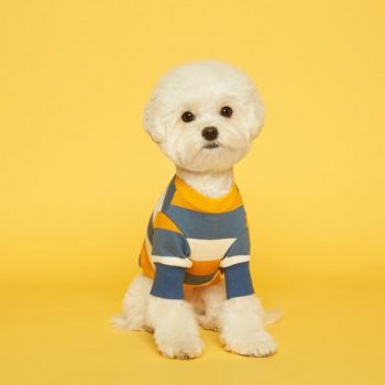 이 강아지 맨투맨 티셔츠의 독특한 특징은 스트라이프 옐로우와 스카이블루로 조화로운 컬러 조합입니다.