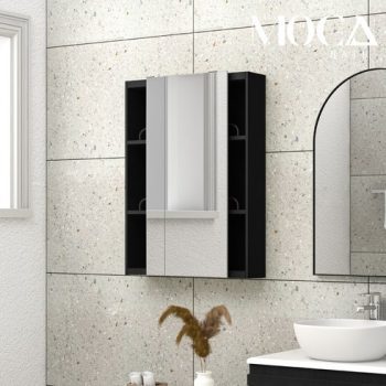 이 제품의 독특한 기능은 모카바스 전면 거울 슬라이드(미닫이) 욕실 수납장의 누드 디자인입니다.