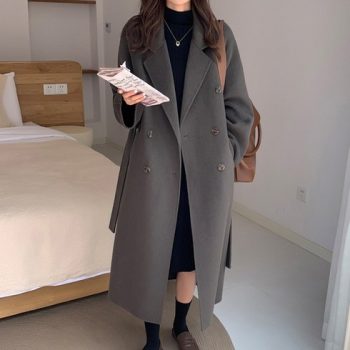 ANYOU 여성 겨울 베이직 모직 코트 루즈핏 하객룩 카라넥 더블버튼 벨트 롱코트 아우터